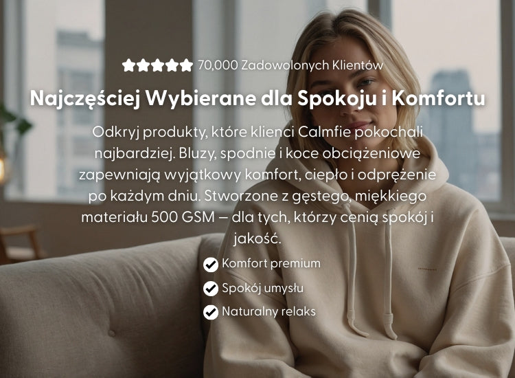 Najwygodniejsza bluza z kapturem, jaką kiedykolwiek kupisz. Nasza supermiękka CalmCloud™ ma kieszenie typu kangur oraz obszerny, podwójnie podszyty kaptur. Bluzy są lekko obciążone i oversize — wielu klientów twierdzi, że pomogły im zredukować lęk i stres.